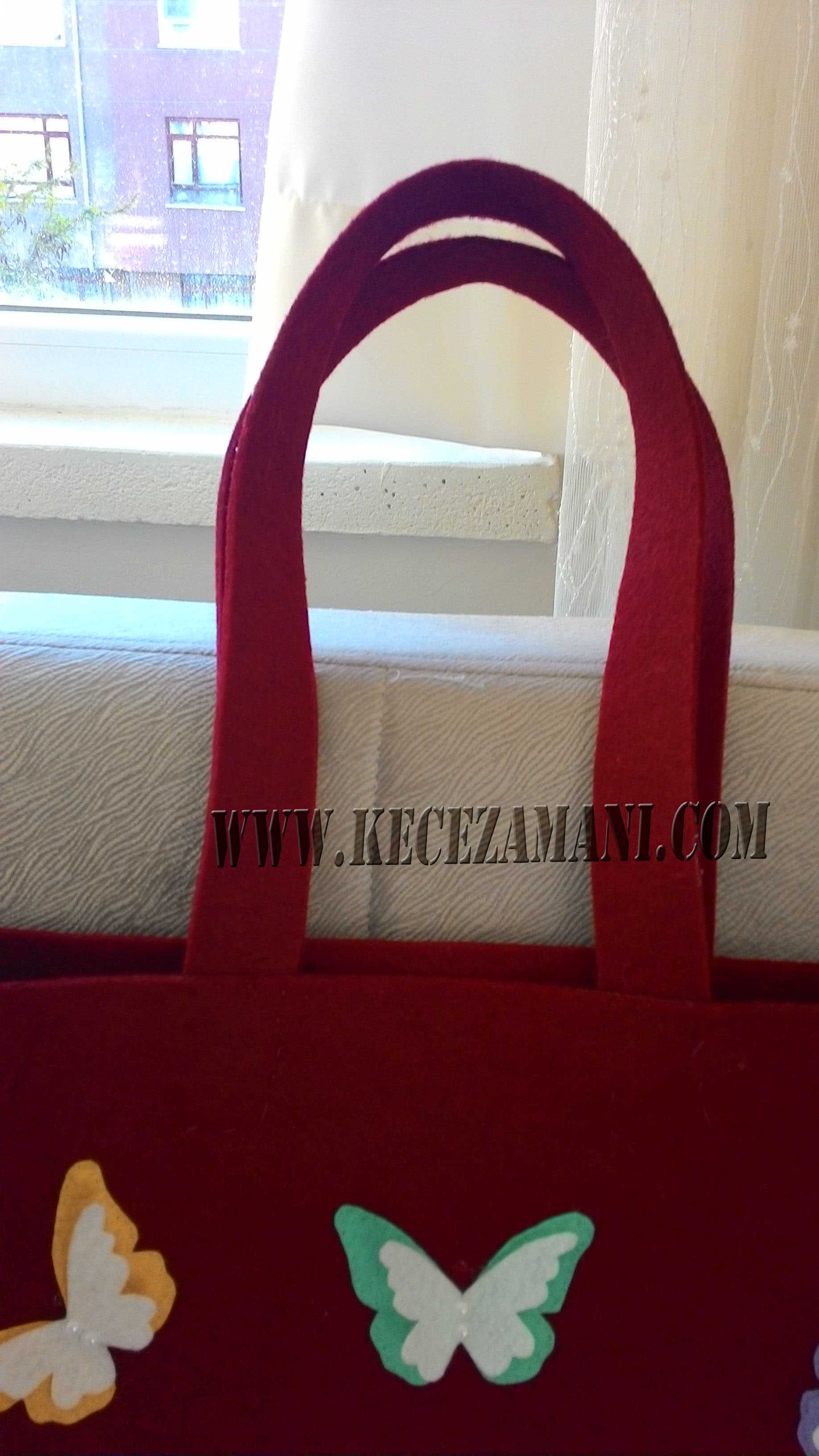 Kırmızı Keçe Rengarenk Kelebekli çantamız Sevil hanım için hazırlanmıştır.Ebatları 40 x40 cm dir.İsteğe göre hazırlanmaktadır.Sipariş vermek ve bilgi almak için iletişim bölümünden irtibata geçebilirsiniz.